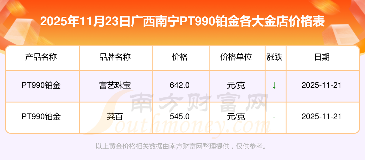 2025年11月23日广西南宁各大金店PT990铂金最新价格查询来了:周大福1305.0元/克,周大福616.0元/克,周大福1305.0元/克,周大福45110.0,周大福17570.0,周大福40690.0,周大福1143.0元/克,老凤祥1298.0元/克,老凤祥600.0元/克,老凤祥1298.0元/克,周六福1266.0元/克。