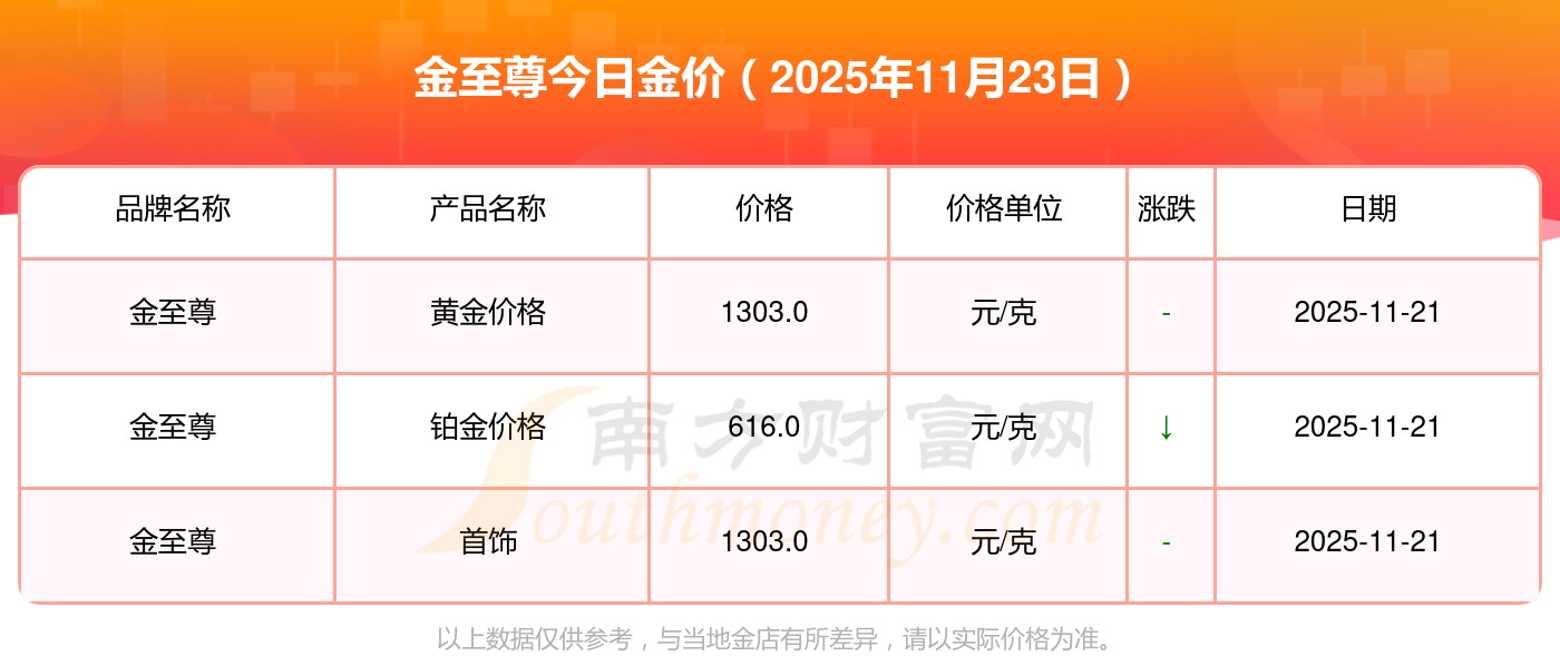 金至尊金价今日价格:黄金价格1305.0元/克,铂金价格616.0元/克,饰品金价(内地)1305.0元/克,黄金饰品(香港)45110.0,铂金价格(香港)17570.0,金条价格(香港)40690.0,金条金价(内地)1143.0元/克,黄金价格1298.0元/克,铂金价格600.0元/克,足金价格1298.0元/克,黄金价格1266.0元/克。