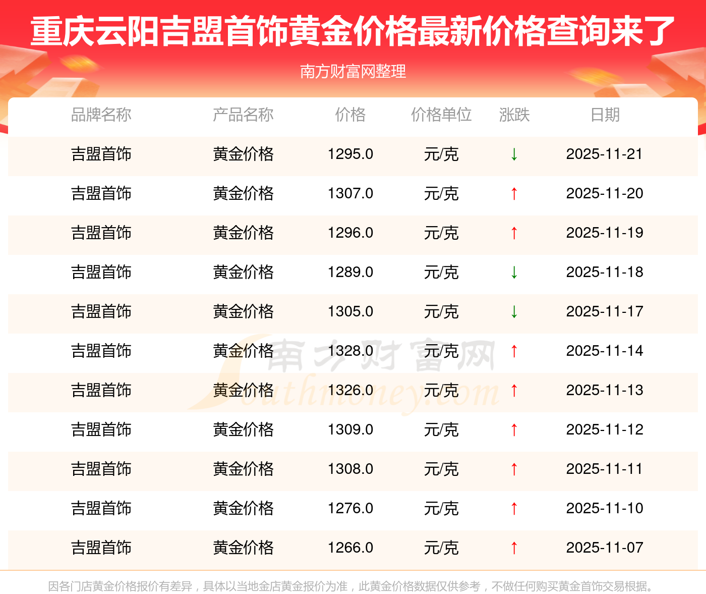 2025年11月23日,重庆云阳吉盟首饰所售黄金价格,其价格设定为 1295.0元/克。