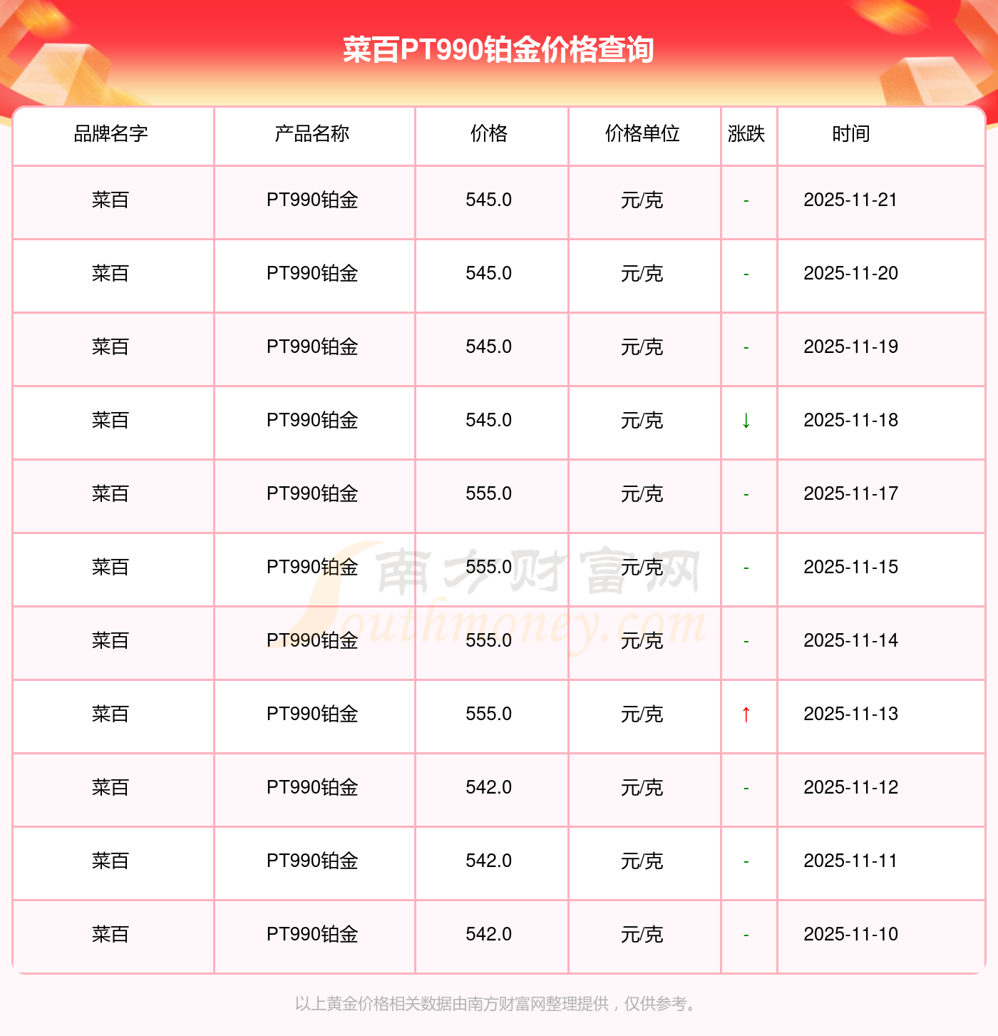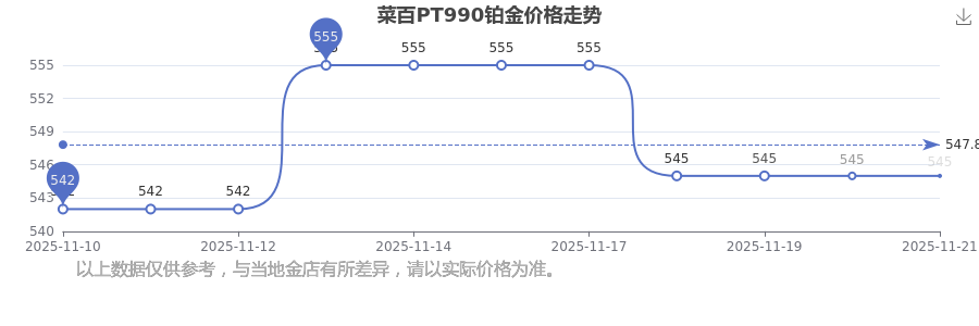 最新数据表明,菜百今日 PT990铂金价格为545.0元/克。
