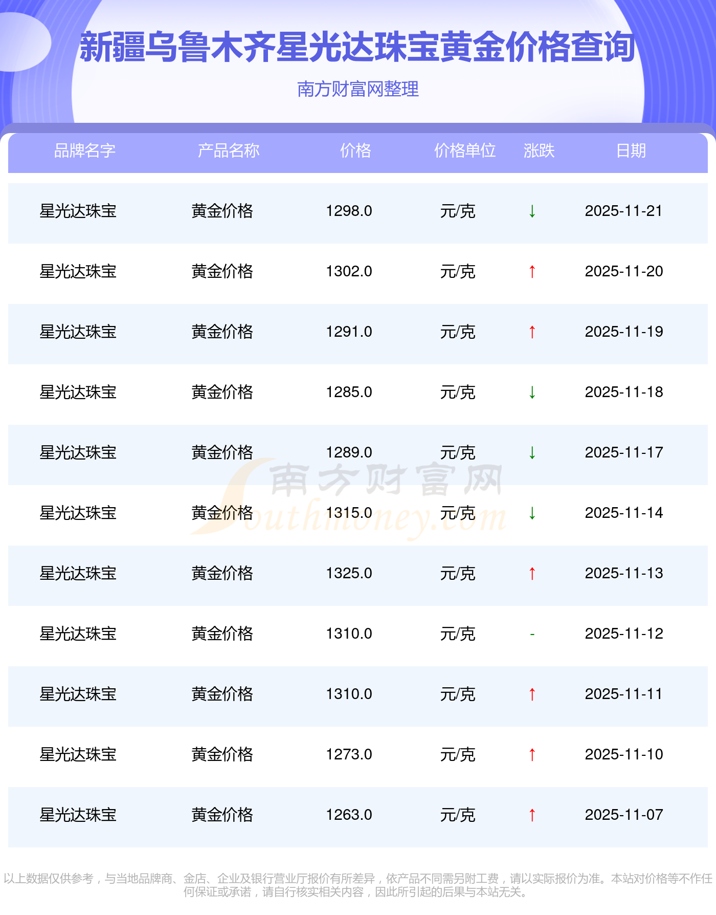 今日新疆乌鲁木齐星光达珠宝黄金价格公布今天,按克计价的黄金价格是多少2025年11月23日,新疆乌鲁木齐星光达珠宝黄金价格每克的售卖价位为1298.0元/克。