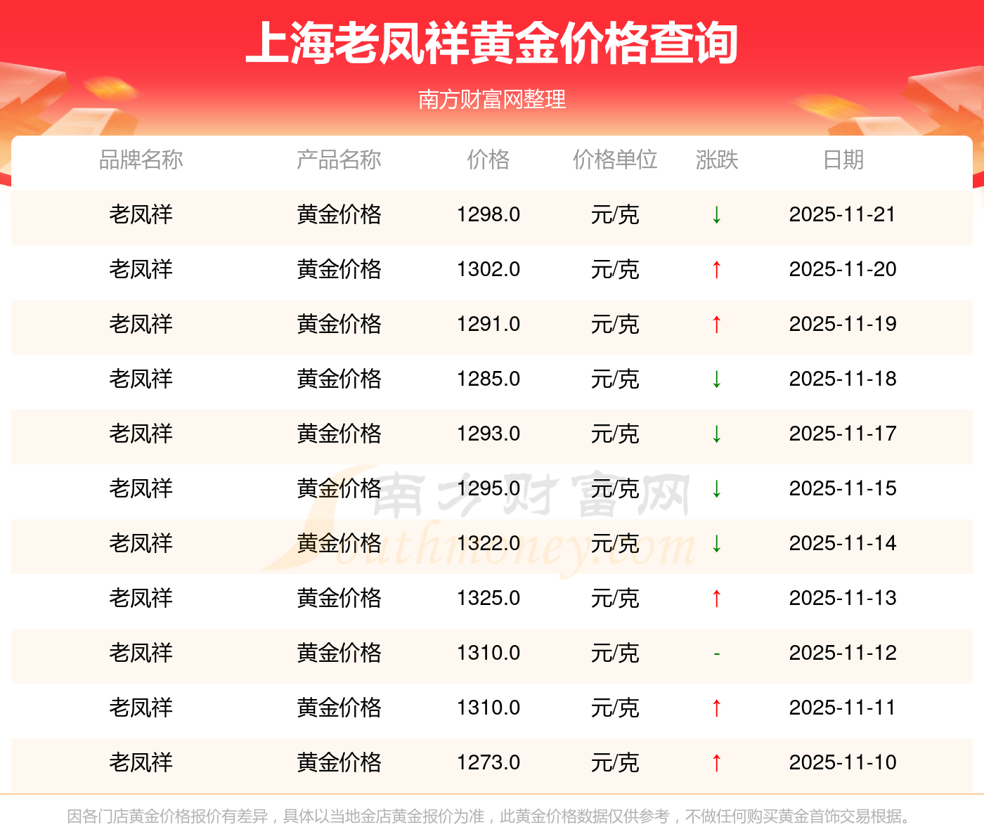 今天是2025年11月23日,周大福、周大福、周大福、周大福、周大福、周大福、周大福、老凤祥、老凤祥、老凤祥、周六福等各大金店品牌黄金价格最新价格如下:周大福1305.0元/克、周大福616.0元/克、周大福1305.0元/克、周大福45110.0、周大福17570.0、周大福40690.0、周大福1143.0元/克、老凤祥1298.0元/克、老凤祥600.0元/克、老凤祥1298.0元/克、周六福1266.0元/克。