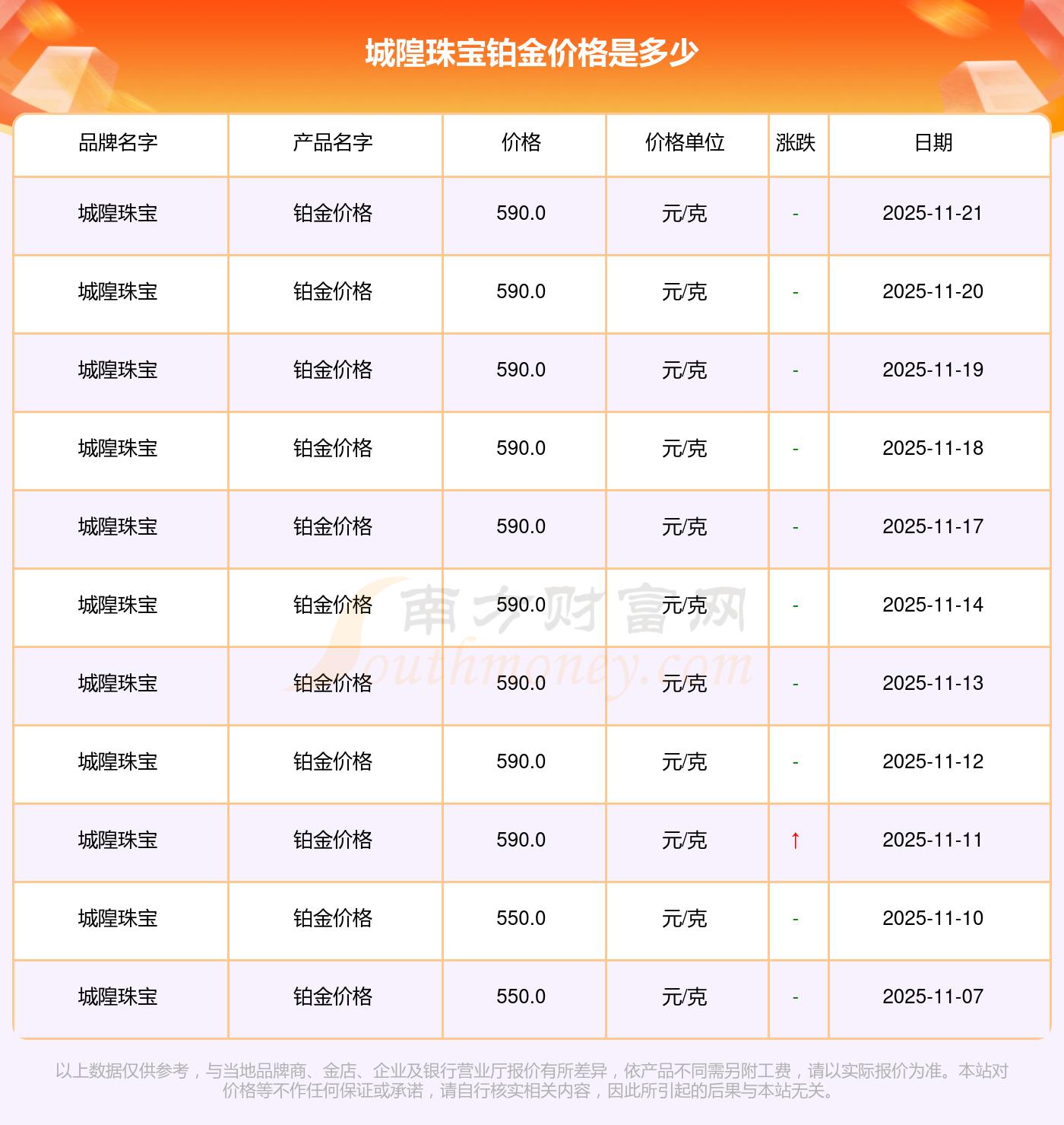 目前城隍珠宝 铂金价格的价格,今日最新为590.0元/克。