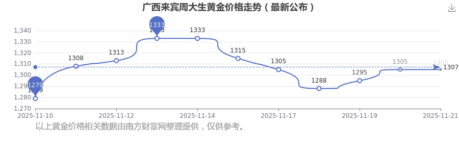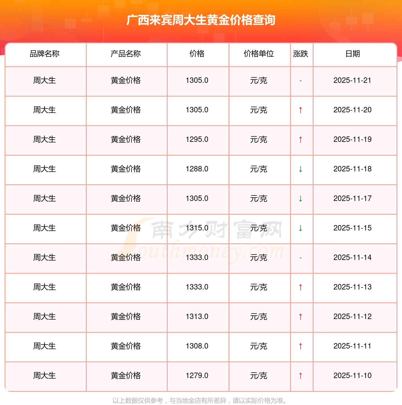广西来宾周大生黄金价格在 2025年11月23日,其市场价格为 1305.0元/克。