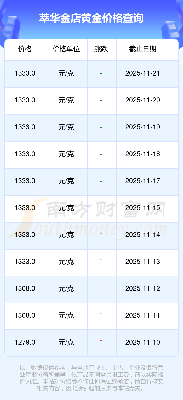 今日萃华金店 黄金价格最新的克重售价为1333.0元/克。