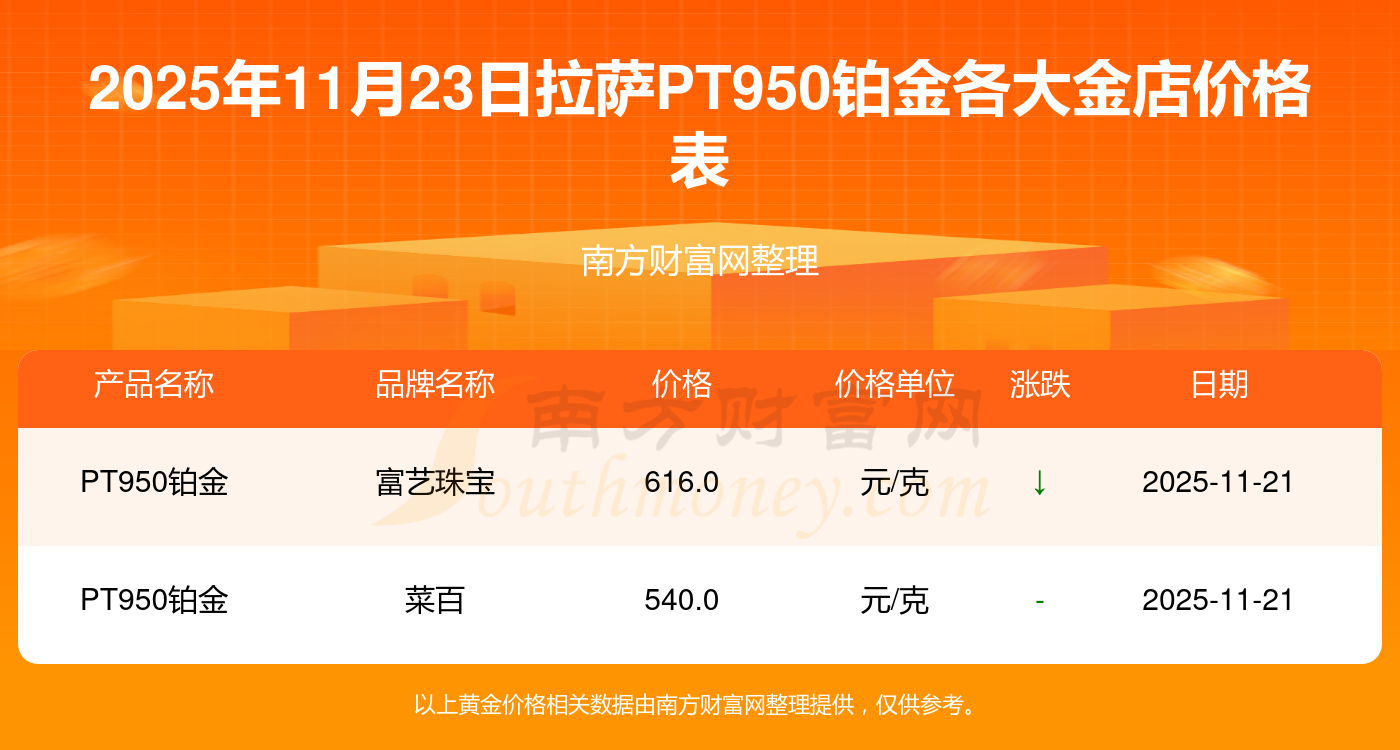 2025年11月23日拉萨周大福、周大福、周大福、周大福、周大福、周大福、周大福、老凤祥、老凤祥、老凤祥、周六福等各大金店品牌PT950铂金最新价格行情来了,如下:周大福黄金价格1305.0元/克,周大福铂金价格616.0元/克,周大福饰品金价(内地)1305.0元/克,周大福黄金饰品(香港)45110.0,周大福铂金价格(香港)17570.0,周大福金条价格(香港)40690.0,周大福金条金价(内地)1143.0元/克,老凤祥黄金价格1298.0元/克,老凤祥铂金价格600.0元/克,老凤祥足金价格1298.0元/克,周六福黄金价格1266.0元/克。