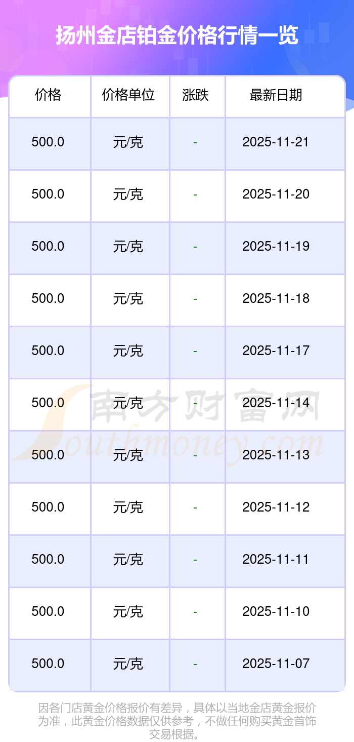 2025年11月23日扬州金店铂金价格查询:500.0元/克。