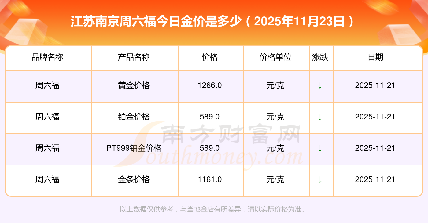 2025年11月23日江苏南京周六福黄金按克计价,现在多少钱一克?黄金价格1305.0元/克,铂金价格616.0元/克,饰品金价(内地)1305.0元/克,黄金饰品(香港)45110.0,铂金价格(香港)17570.0,金条价格(香港)40690.0,金条金价(内地)1143.0元/克,黄金价格1298.0元/克,铂金价格600.0元/克,足金价格1298.0元/克,黄金价格1266.0元/克。