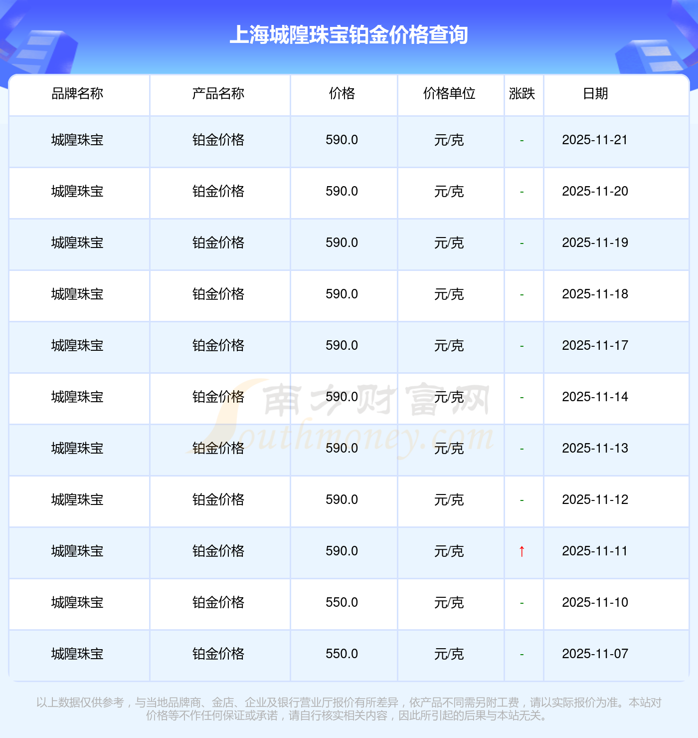 今日上海城隍珠宝铂金价格为590.0元/克。