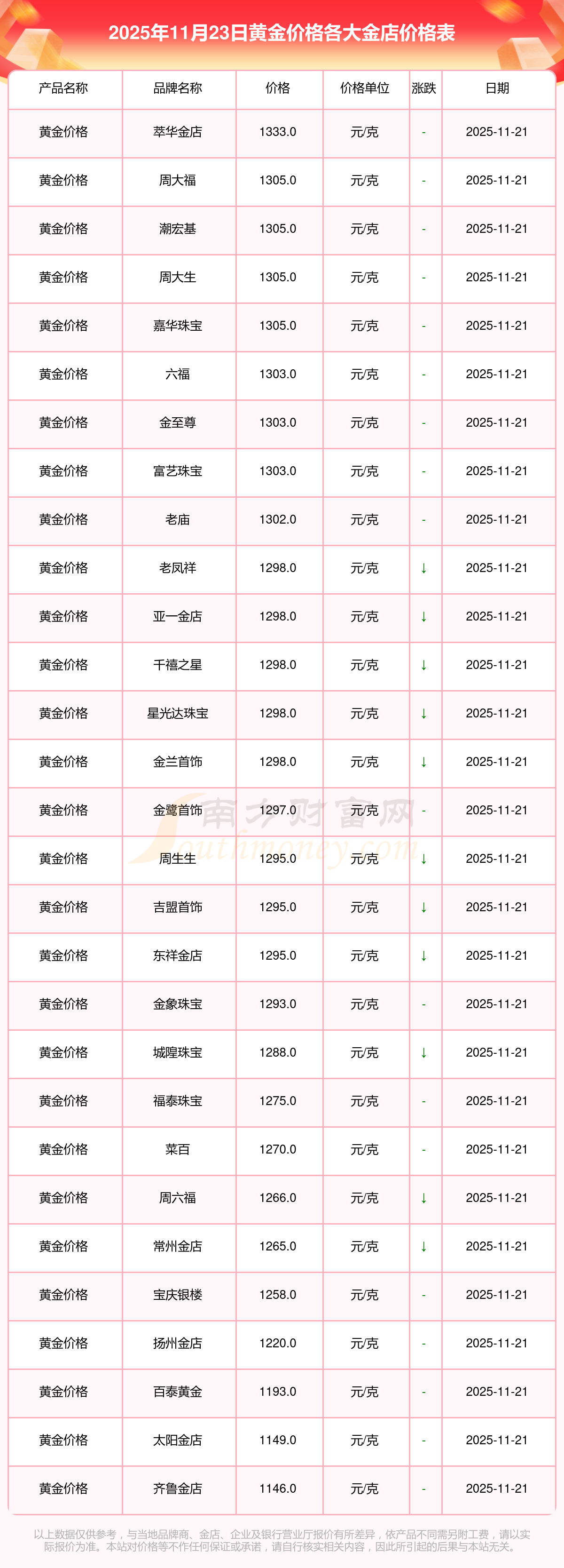 2025年11月23日周大福、周大福、周大福、周大福、周大福、周大福、周大福、老凤祥、老凤祥、老凤祥、周六福等各大金店品牌黄金价格最新价格如下:周大福黄金价格1305.0元/克,周大福铂金价格616.0元/克,周大福饰品金价(内地)1305.0元/克,周大福黄金饰品(香港)45110.0,周大福铂金价格(香港)17570.0,周大福金条价格(香港)40690.0,周大福金条金价(内地)1143.0元/克,老凤祥黄金价格1298.0元/克,老凤祥铂金价格600.0元/克,老凤祥足金价格1298.0元/克,周六福黄金价格1266.0元/克。