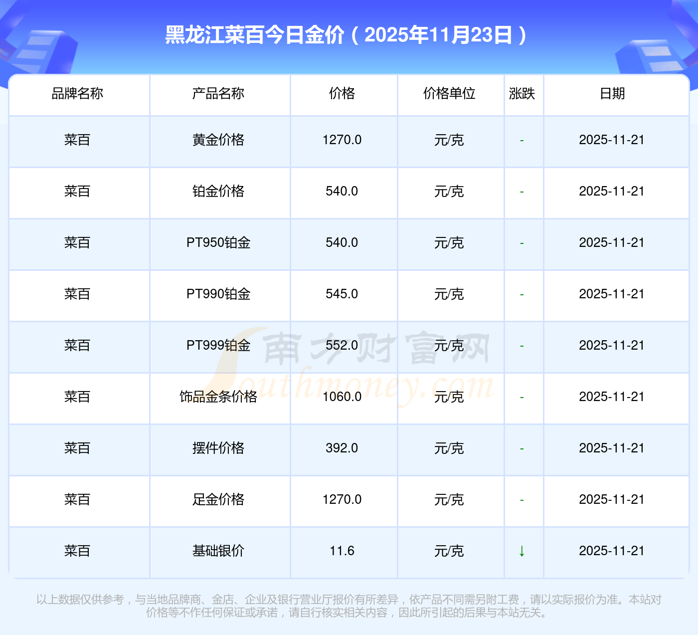 以上数据仅供参考,与当地品牌商、金店、企业及银行营业厅报价有所差异,依产品不同需另附工费,请以实际报价为准。本站对价格等不作任何保证或承诺,请自行核实相关内容,因此所引起的后果与本站无关。