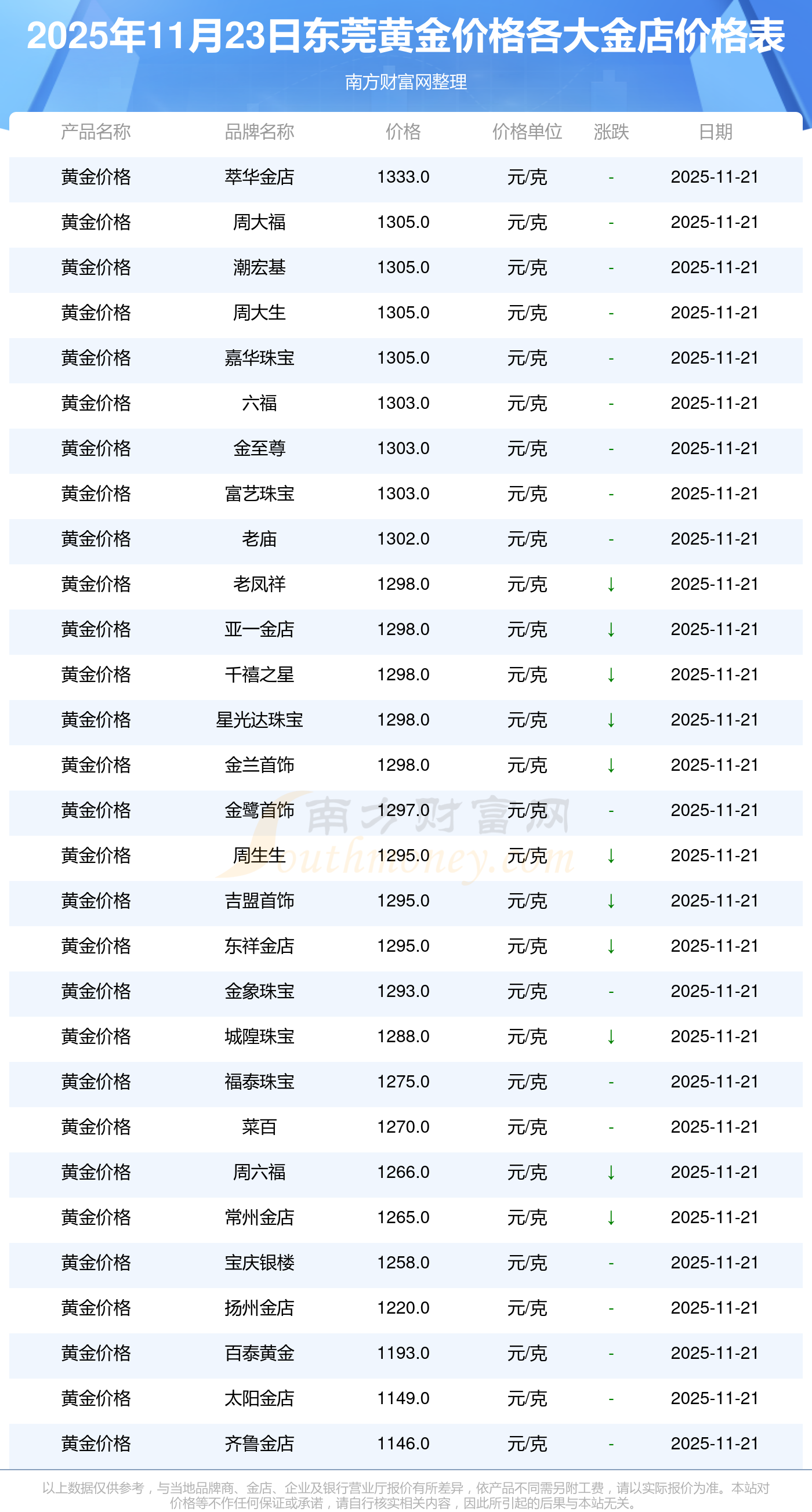 2025年11月23日,东莞周大福、周大福、周大福、周大福、周大福、周大福、周大福、老凤祥、老凤祥、老凤祥、周六福等各大金店品牌黄金价格今日价格如下:周大福1305.0元/克、周大福616.0元/克、周大福1305.0元/克、周大福45110.0、周大福17570.0、周大福40690.0、周大福1143.0元/克、老凤祥1298.0元/克、老凤祥600.0元/克、老凤祥1298.0元/克、周六福1266.0元/克。