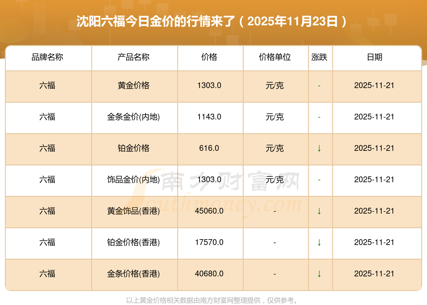2025年11月23日沈阳六福现在购买一克黄金需要支付多少钱?黄金价格1305.0元/克,铂金价格616.0元/克,饰品金价(内地)1305.0元/克,黄金饰品(香港)45110.0,铂金价格(香港)17570.0,金条价格(香港)40690.0,金条金价(内地)1143.0元/克,黄金价格1298.0元/克,铂金价格600.0元/克,足金价格1298.0元/克,黄金价格1266.0元/克。