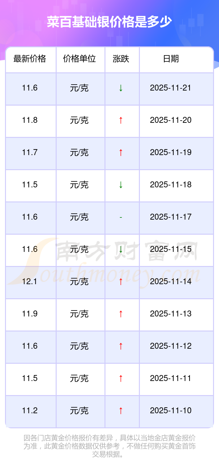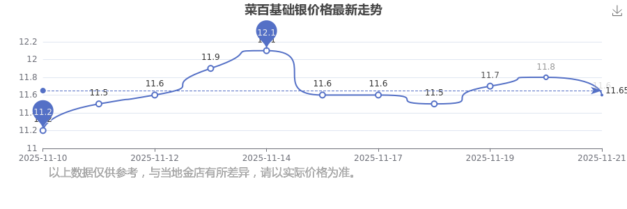 菜百 基础银价于今日的最新挂牌价为11.6元/克。