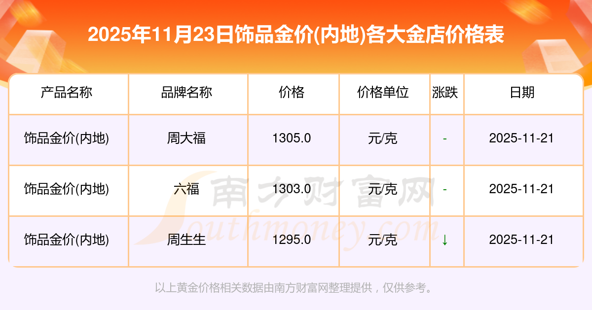 2025年11月23日,周大福、周大福、周大福、周大福、周大福、周大福、周大福、老凤祥、老凤祥、老凤祥、周六福等各大金店品牌饰品金价(内地)今日价格如下:周大福1305.0元/克、周大福616.0元/克、周大福1305.0元/克、周大福45110.0、周大福17570.0、周大福40690.0、周大福1143.0元/克、老凤祥1298.0元/克、老凤祥600.0元/克、老凤祥1298.0元/克、周六福1266.0元/克。