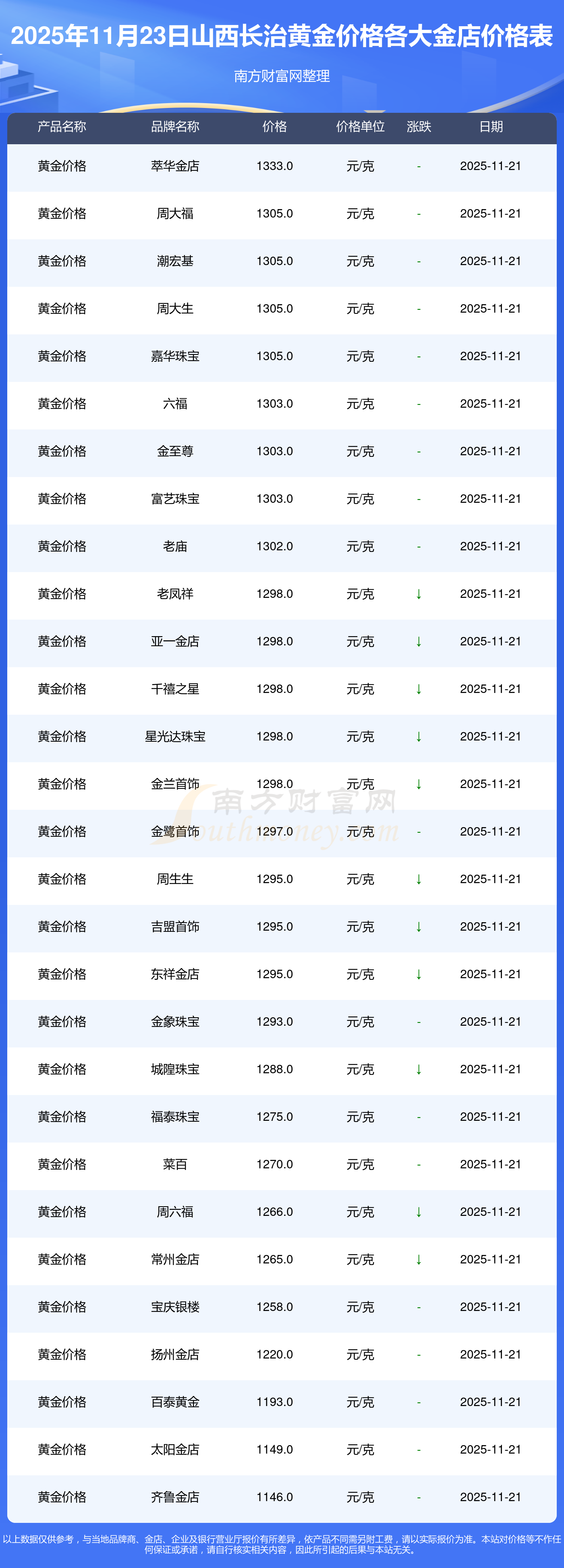 2025年11月23日山西长治周大福、周大福、周大福、周大福、周大福、周大福、周大福、老凤祥、老凤祥、老凤祥、周六福等各大金店品牌黄金价格最新价格行情来了,如下:周大福黄金价格1305.0元/克,周大福铂金价格616.0元/克,周大福饰品金价(内地)1305.0元/克,周大福黄金饰品(香港)45110.0,周大福铂金价格(香港)17570.0,周大福金条价格(香港)40690.0,周大福金条金价(内地)1143.0元/克,老凤祥黄金价格1298.0元/克,老凤祥铂金价格600.0元/克,老凤祥足金价格1298.0元/克,周六福黄金价格1266.0元/克。