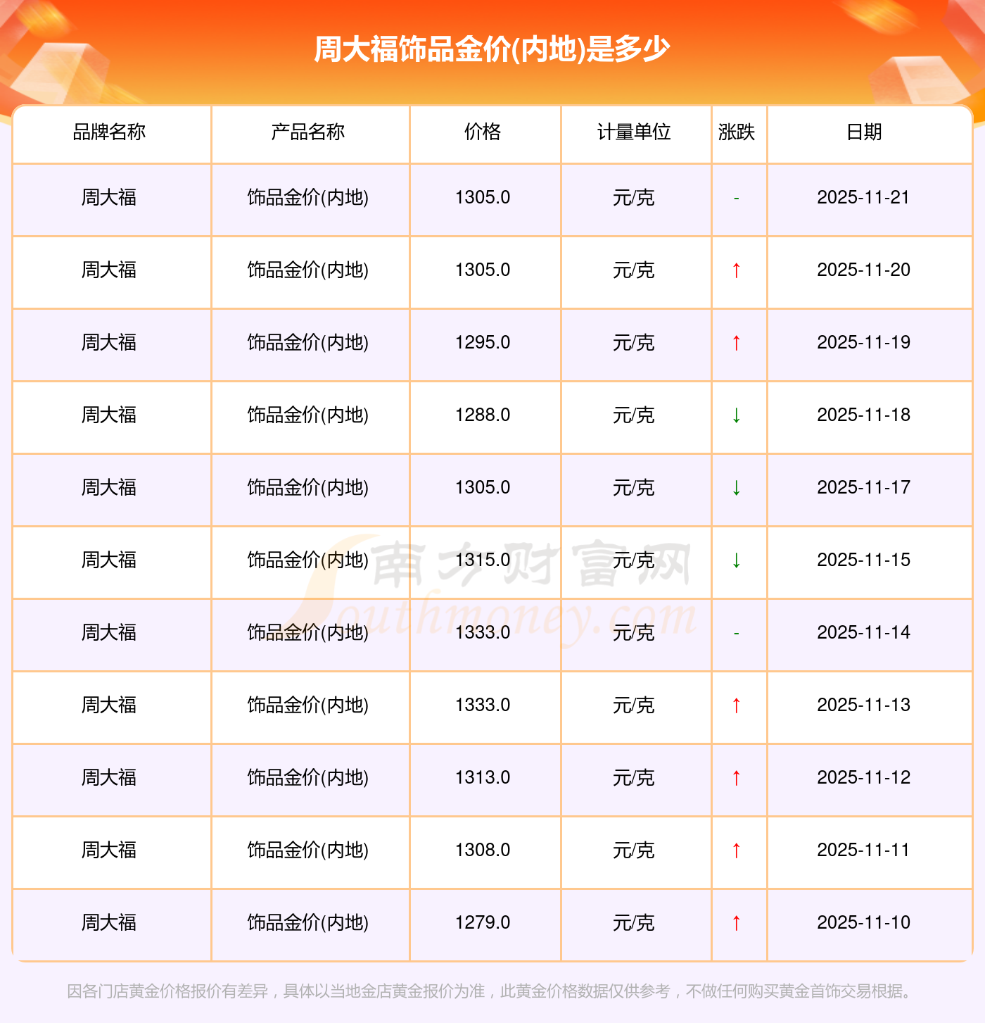 周大福 饰品金价(内地)在今日更新至1305.0元/克。