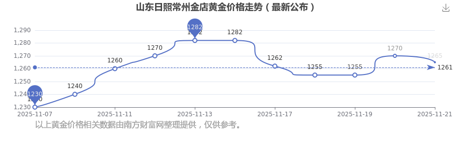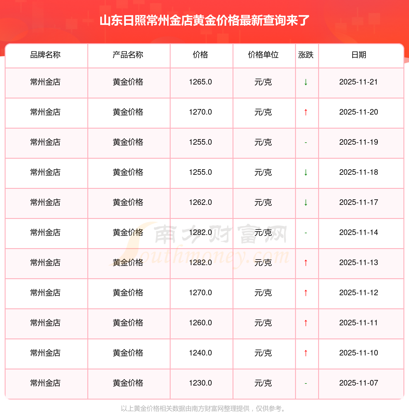 今日(2025年11月23日),山东日照常州金店黄金价格:1265.0元/克。