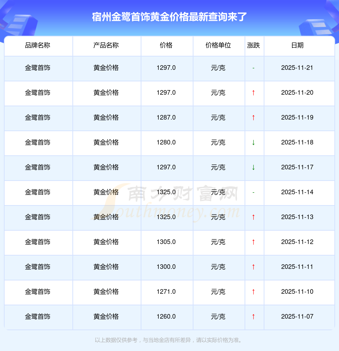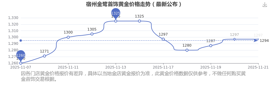 (2025年11月23日)今日宿州金鹭首饰黄金价格是1297.0元/克。