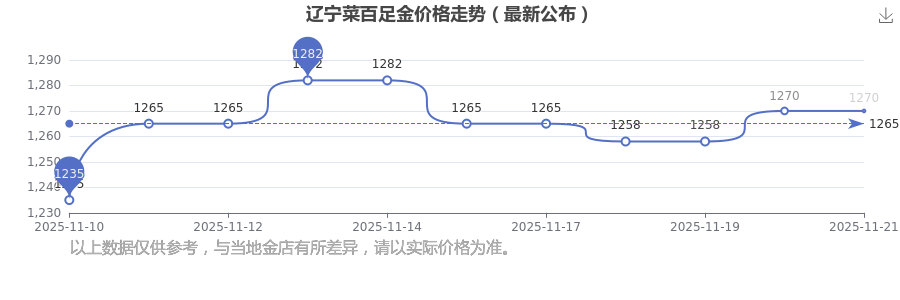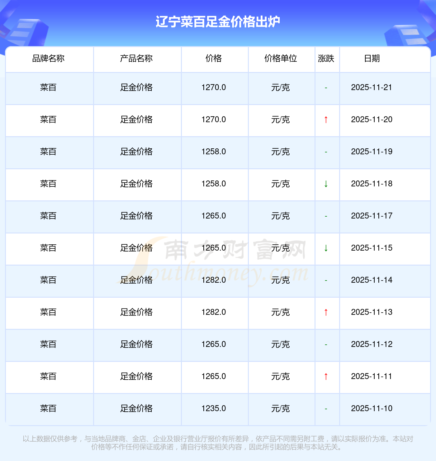 今日(2025年11月23日),辽宁菜百足金价格:1270.0元/克。