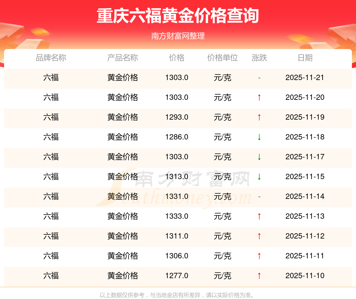 今日2025年11月23日,重庆六福黄金价格为1303.0元/克。