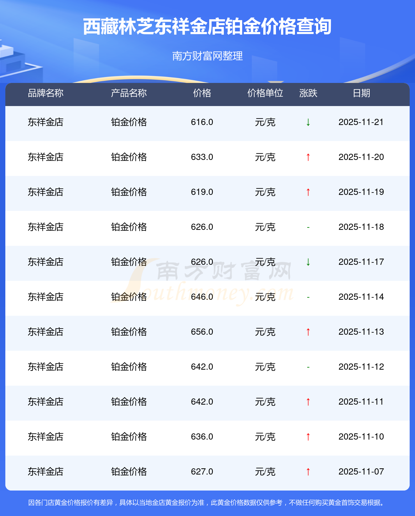 2025年11月23日各大金店铂金价格最新价格:周大福1305.0元/克,周大福616.0元/克,周大福1305.0元/克,周大福45110.0,周大福17570.0,周大福40690.0,周大福1143.0元/克,老凤祥1298.0元/克,老凤祥600.0元/克,老凤祥1298.0元/克,周六福1266.0元/克。