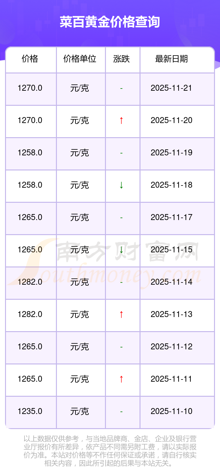 今日(2025年11月23日)菜百黄金价格:1270.0元/克。