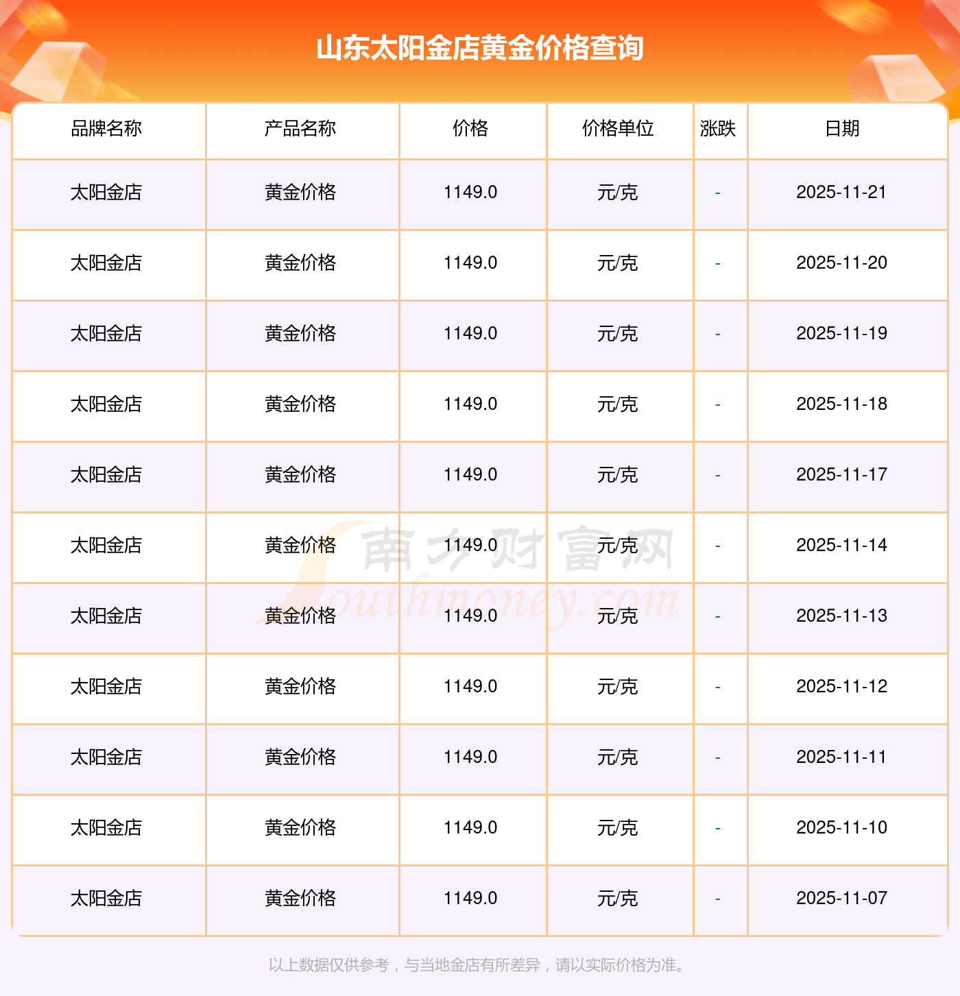 2025年11月23日,今日山东太阳金店黄金价格:1149.0元/克。