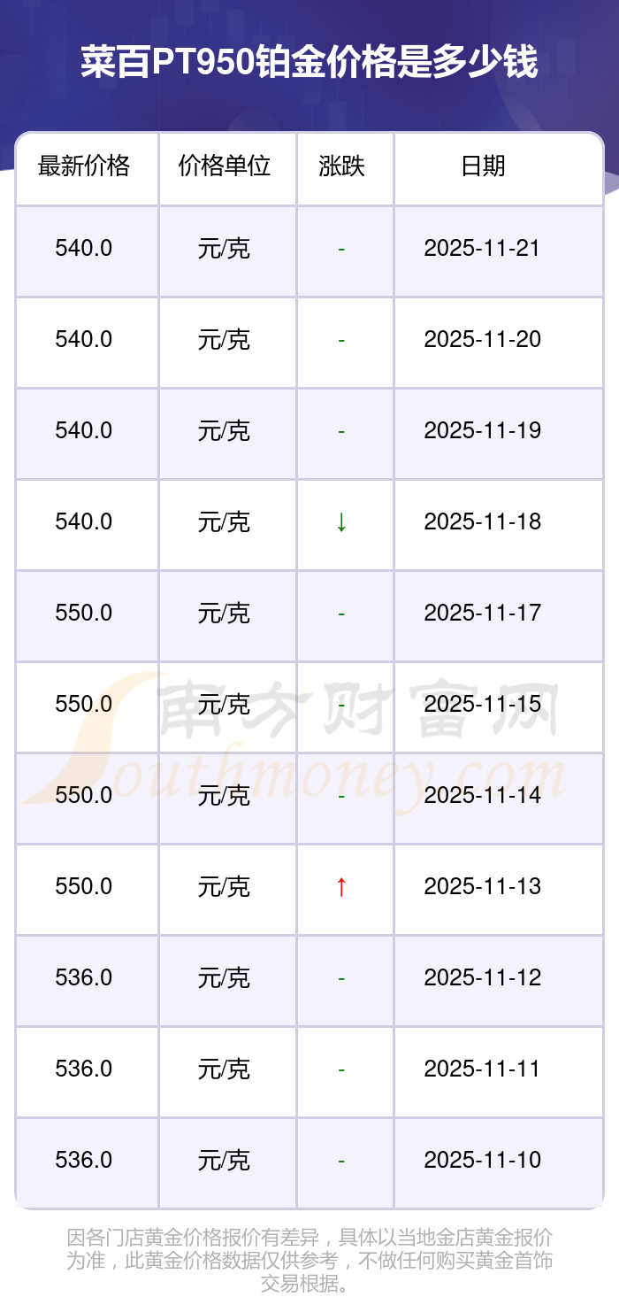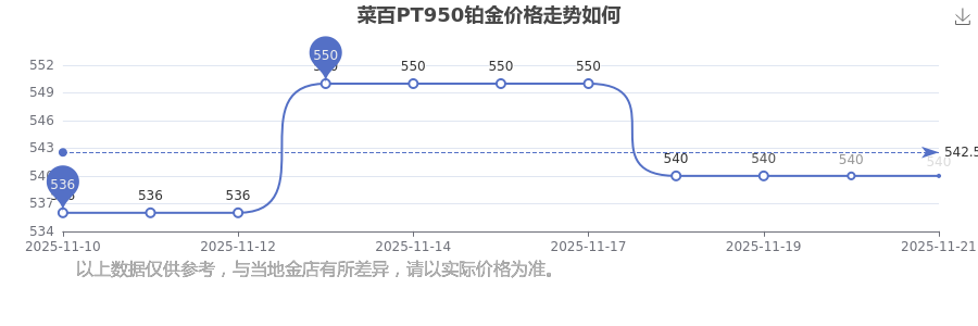 今日(2025年11月23日),菜百PT950铂金最新价格是540.0元/克。