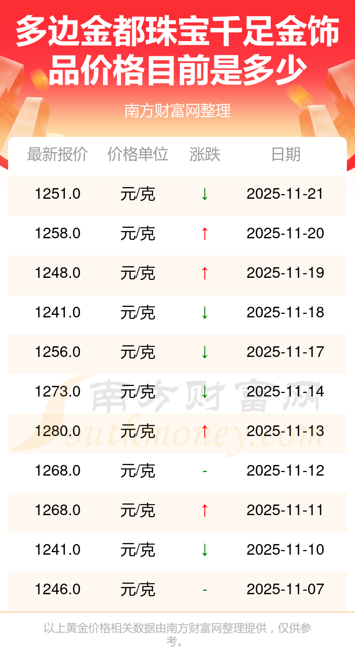 今日多边金都珠宝千足金饰品价格为1251.0元/克。