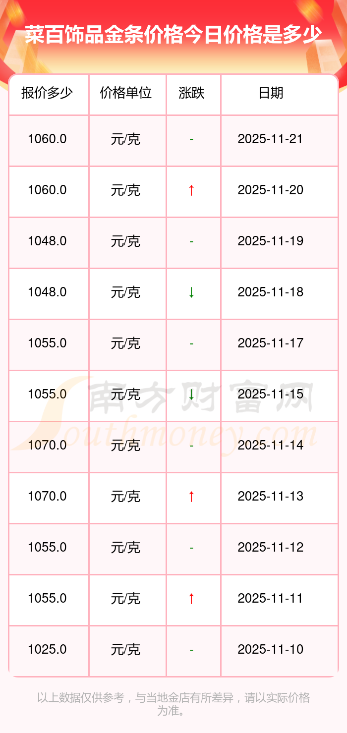 今日(2025年11月23日)菜百饰品金条价格为1060.0元/克。