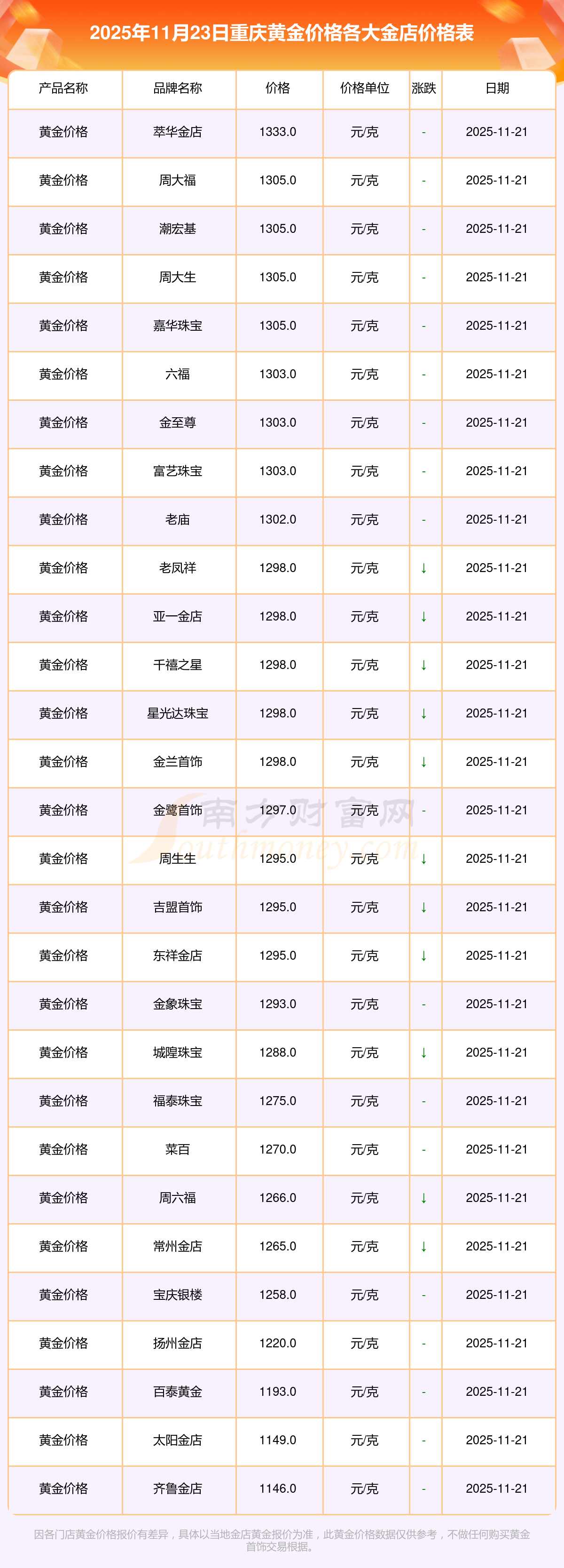 2025年11月23日重庆各大金店黄金价格最新价格:周大福1305.0元/克,周大福616.0元/克,周大福1305.0元/克,周大福45110.0,周大福17570.0,周大福40690.0,周大福1143.0元/克,老凤祥1298.0元/克,老凤祥600.0元/克,老凤祥1298.0元/克,周六福1266.0元/克。