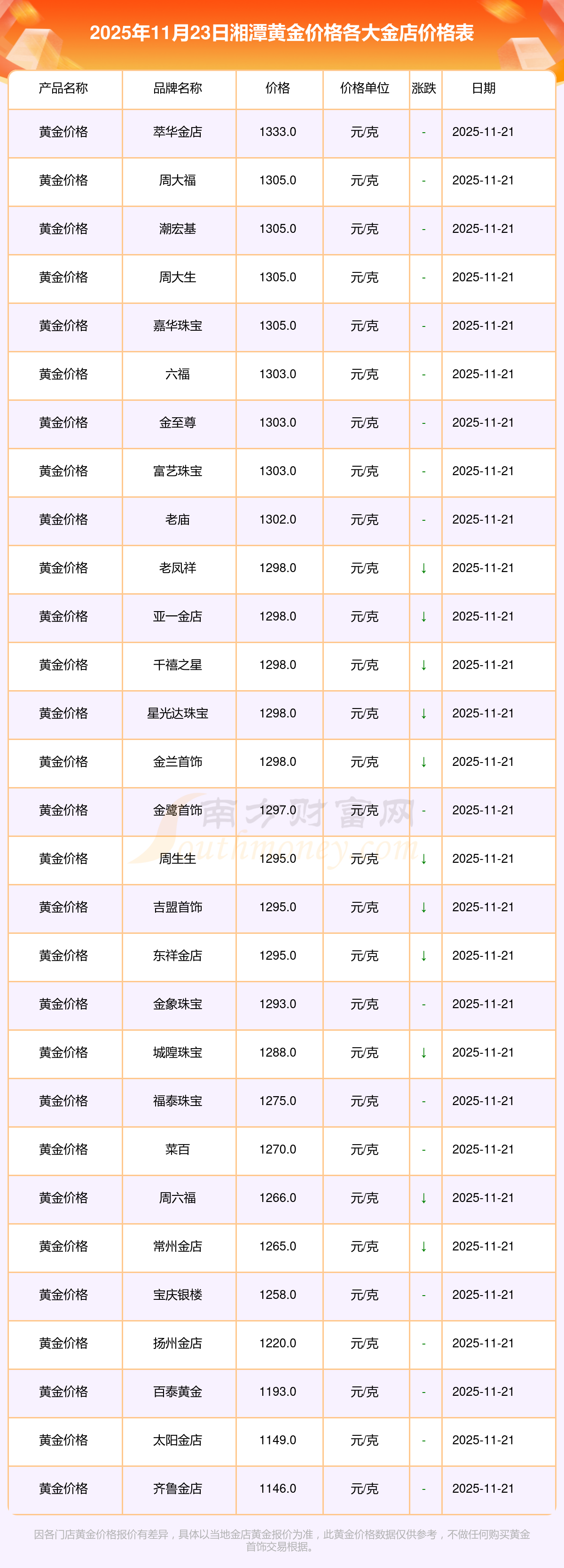 2025年11月23日湘潭周大福、周大福、周大福、周大福、周大福、周大福、周大福、老凤祥、老凤祥、老凤祥、周六福等各大金店品牌黄金价格最新价格行情来了,如下:周大福黄金价格1305.0元/克,周大福铂金价格616.0元/克,周大福饰品金价(内地)1305.0元/克,周大福黄金饰品(香港)45110.0,周大福铂金价格(香港)17570.0,周大福金条价格(香港)40690.0,周大福金条金价(内地)1143.0元/克,老凤祥黄金价格1298.0元/克,老凤祥铂金价格600.0元/克,老凤祥足金价格1298.0元/克,周六福黄金价格1266.0元/克。