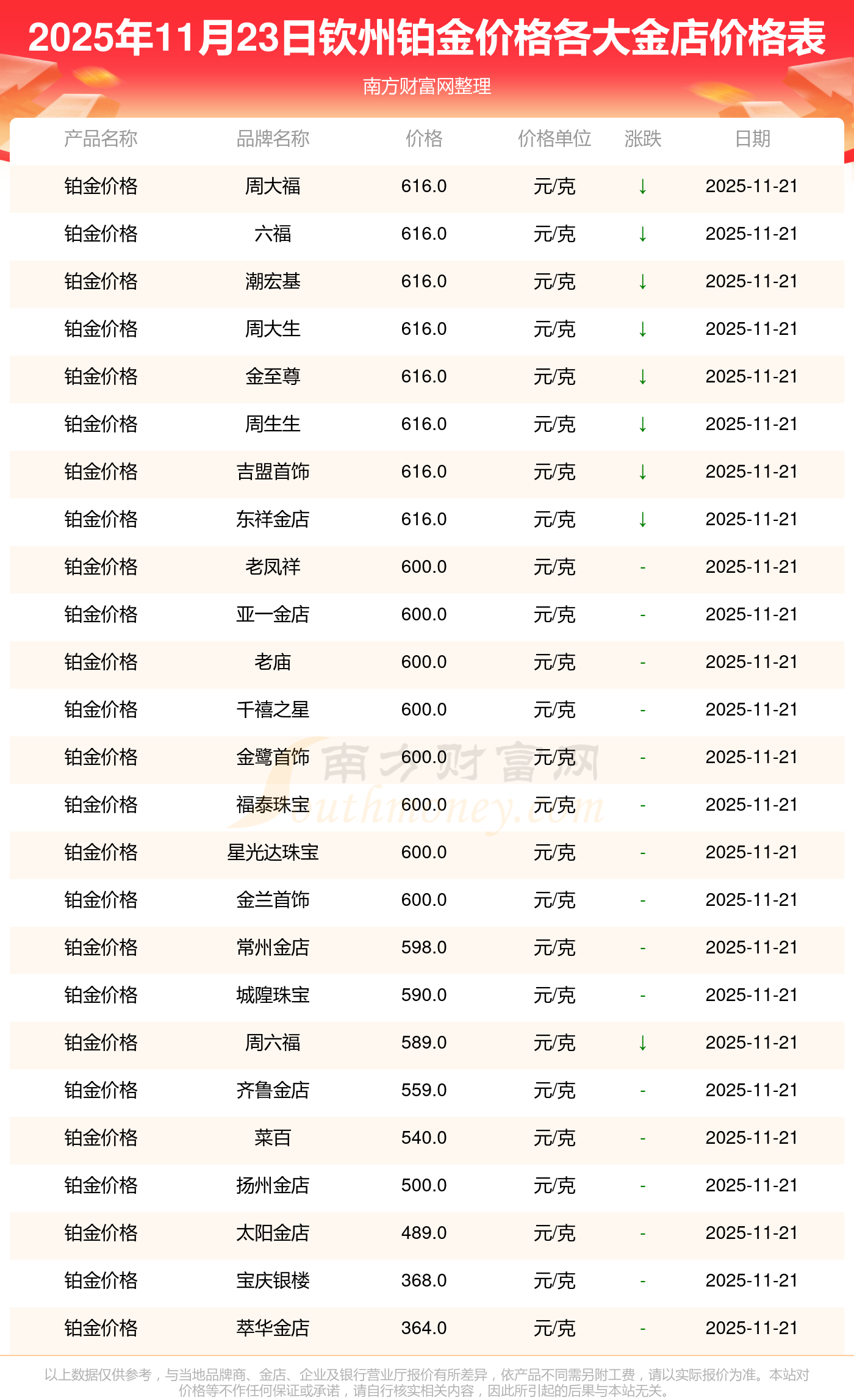 2025年11月23日钦州各大金店铂金价格最新价格:周大福1305.0元/克,周大福616.0元/克,周大福1305.0元/克,周大福45110.0,周大福17570.0,周大福40690.0,周大福1143.0元/克,老凤祥1298.0元/克,老凤祥600.0元/克,老凤祥1298.0元/克,周六福1266.0元/克。