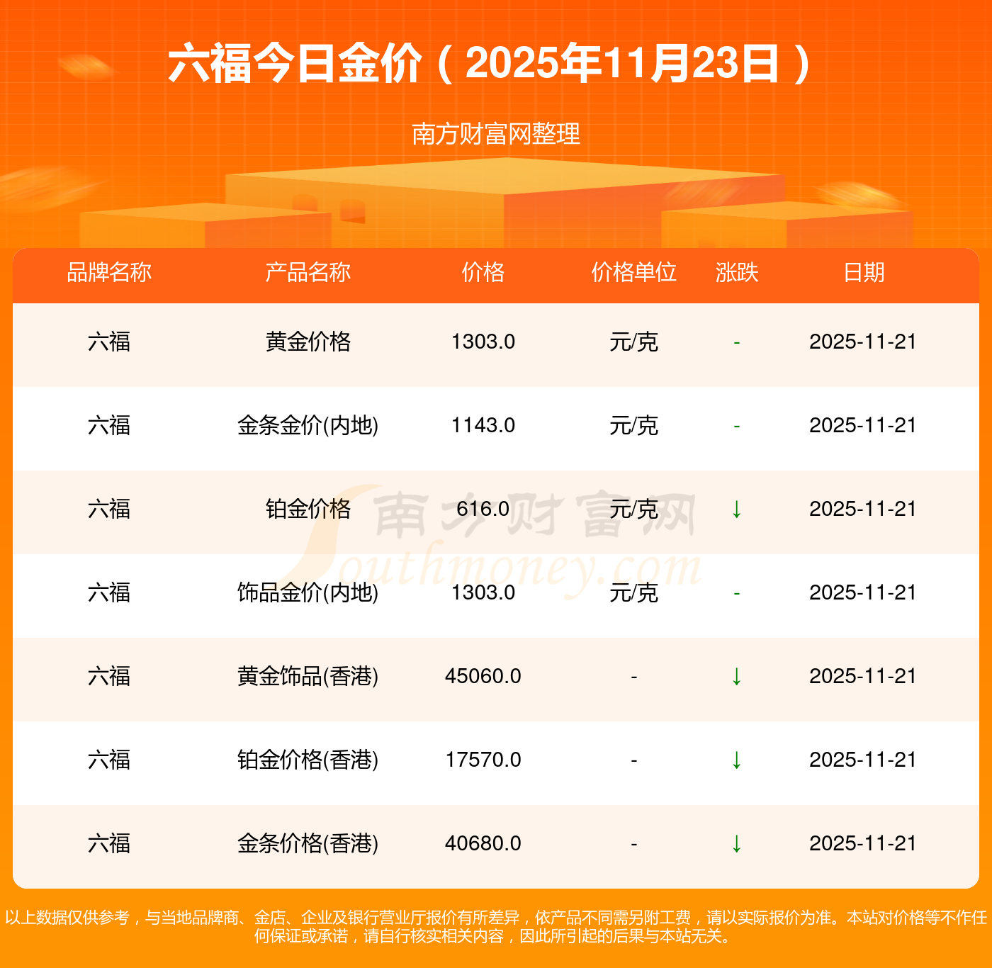 六福黄金在今日的定价为多少?黄金价格1305.0元/克,铂金价格616.0元/克,饰品金价(内地)1305.0元/克,黄金饰品(香港)45110.0,铂金价格(香港)17570.0,金条价格(香港)40690.0,金条金价(内地)1143.0元/克,黄金价格1298.0元/克,铂金价格600.0元/克,足金价格1298.0元/克,黄金价格1266.0元/克。