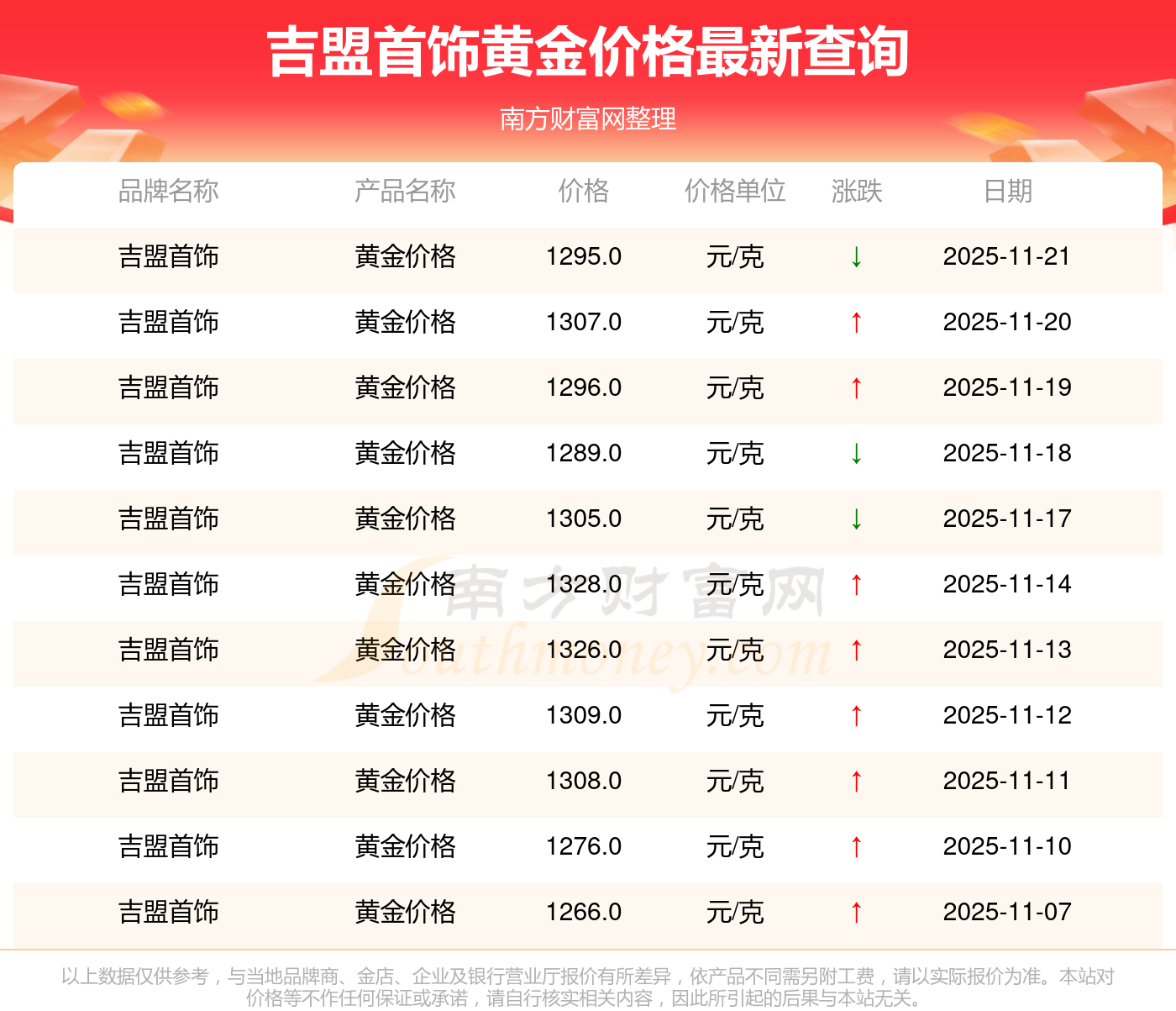 今日吉盟首饰黄金价格最新查询:1295.0元/克。