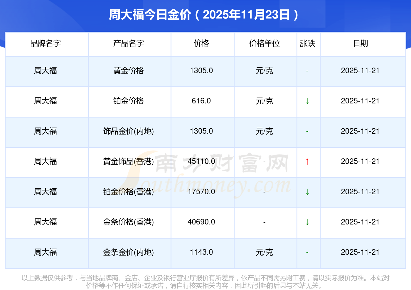 2025年11月23日,周大福、周大福、周大福、周大福、周大福、周大福、周大福、老凤祥、老凤祥、老凤祥、周六福等各大金店品牌铂金价格今日价格如下:周大福1305.0元/克、周大福616.0元/克、周大福1305.0元/克、周大福45110.0、周大福17570.0、周大福40690.0、周大福1143.0元/克、老凤祥1298.0元/克、老凤祥600.0元/克、老凤祥1298.0元/克、周六福1266.0元/克。