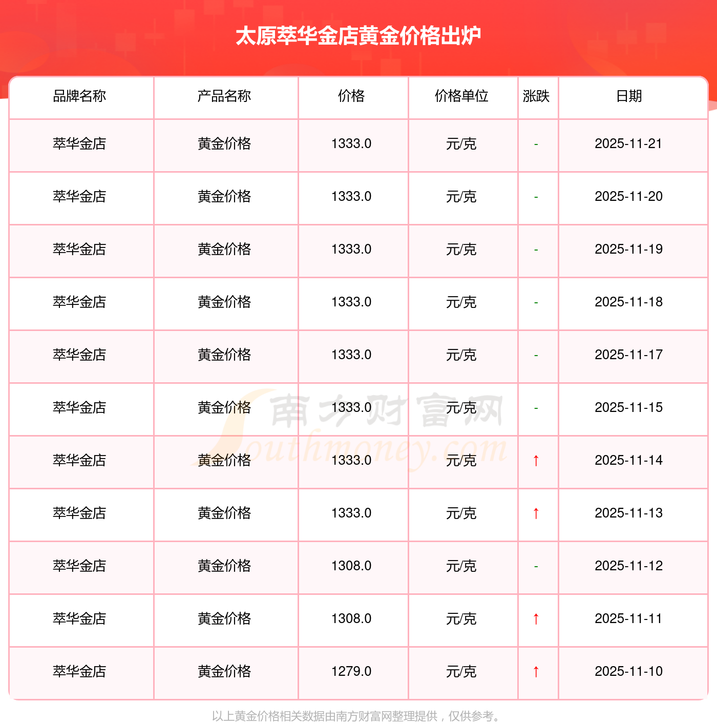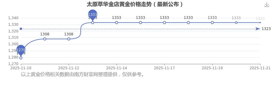 今日(2025年11月23日)太原萃华金店黄金价格为1333.0元/克。