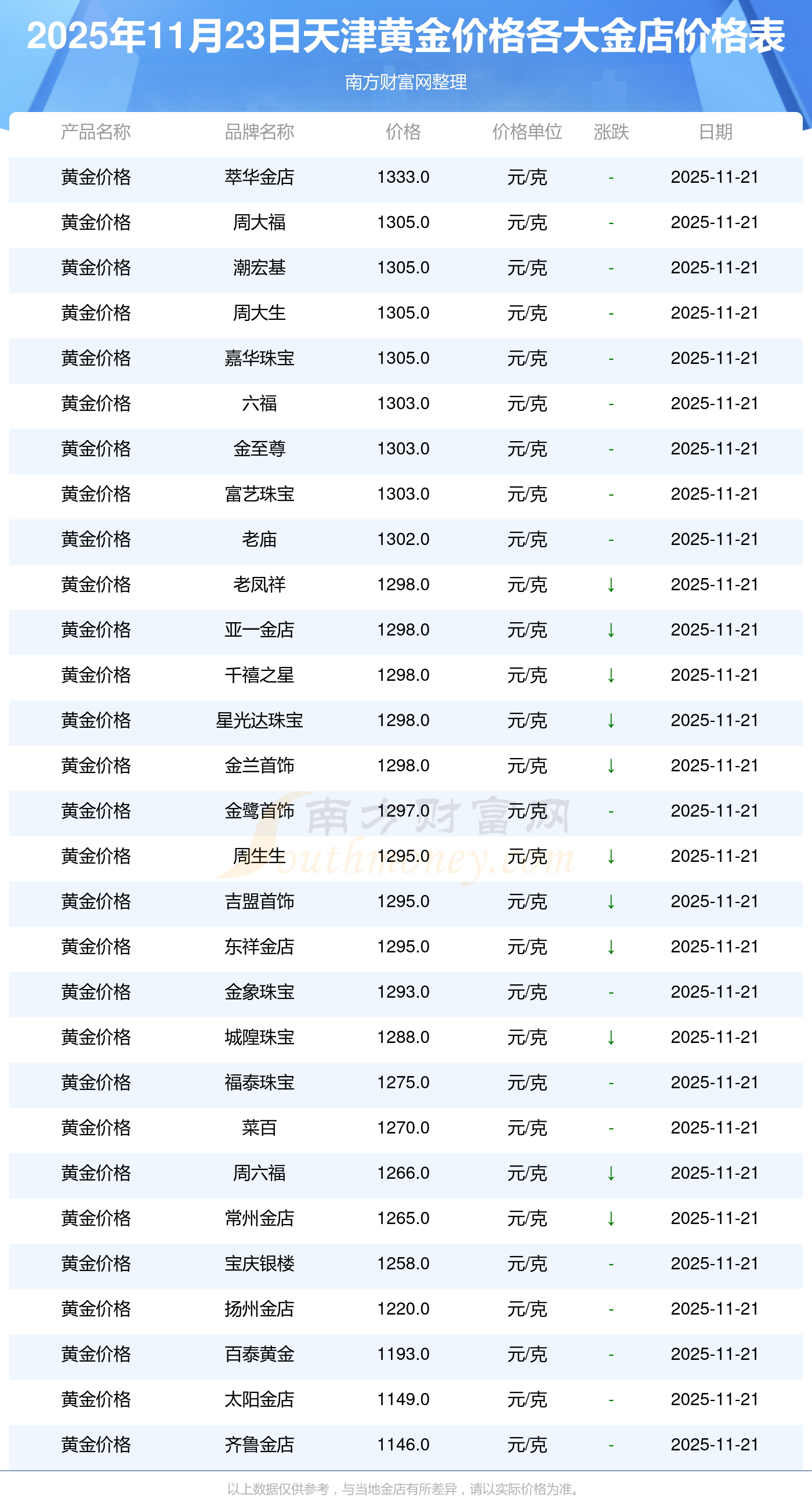 一、2025年11月23日天津周大福、周大福、周大福、周大福、周大福、周大福、周大福、老凤祥、老凤祥、老凤祥、周六福等各大金店品牌黄金价格最新价格行情来了,如下:周大福黄金价格1305.0元/克,周大福铂金价格616.0元/克,周大福饰品金价(内地)1305.0元/克,周大福黄金饰品(香港)45110.0,周大福铂金价格(香港)17570.0,周大福金条价格(香港)40690.0,周大福金条金价(内地)1143.0元/克,老凤祥黄金价格1298.0元/克,老凤祥铂金价格600.0元/克,老凤祥足金价格1298.0元/克,周六福黄金价格1266.0元/克。