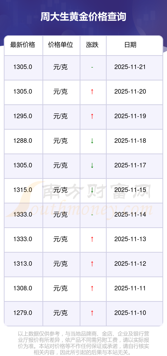 今日(2025年11月23日)周大生黄金价格:1305.0元/克。