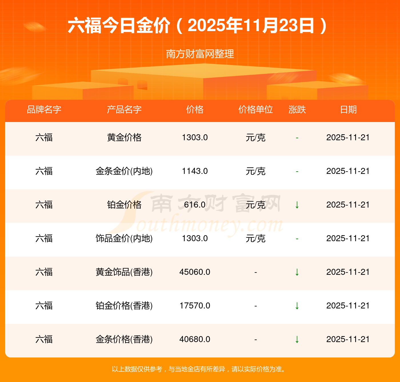 2025年11月23日六福最新价格:黄金价格1305.0元/克,铂金价格616.0元/克,饰品金价(内地)1305.0元/克,黄金饰品(香港)45110.0,铂金价格(香港)17570.0,金条价格(香港)40690.0,金条金价(内地)1143.0元/克,黄金价格1298.0元/克,铂金价格600.0元/克,足金价格1298.0元/克,黄金价格1266.0元/克。