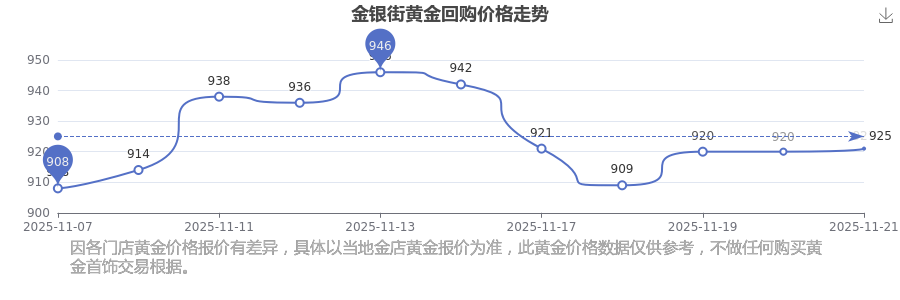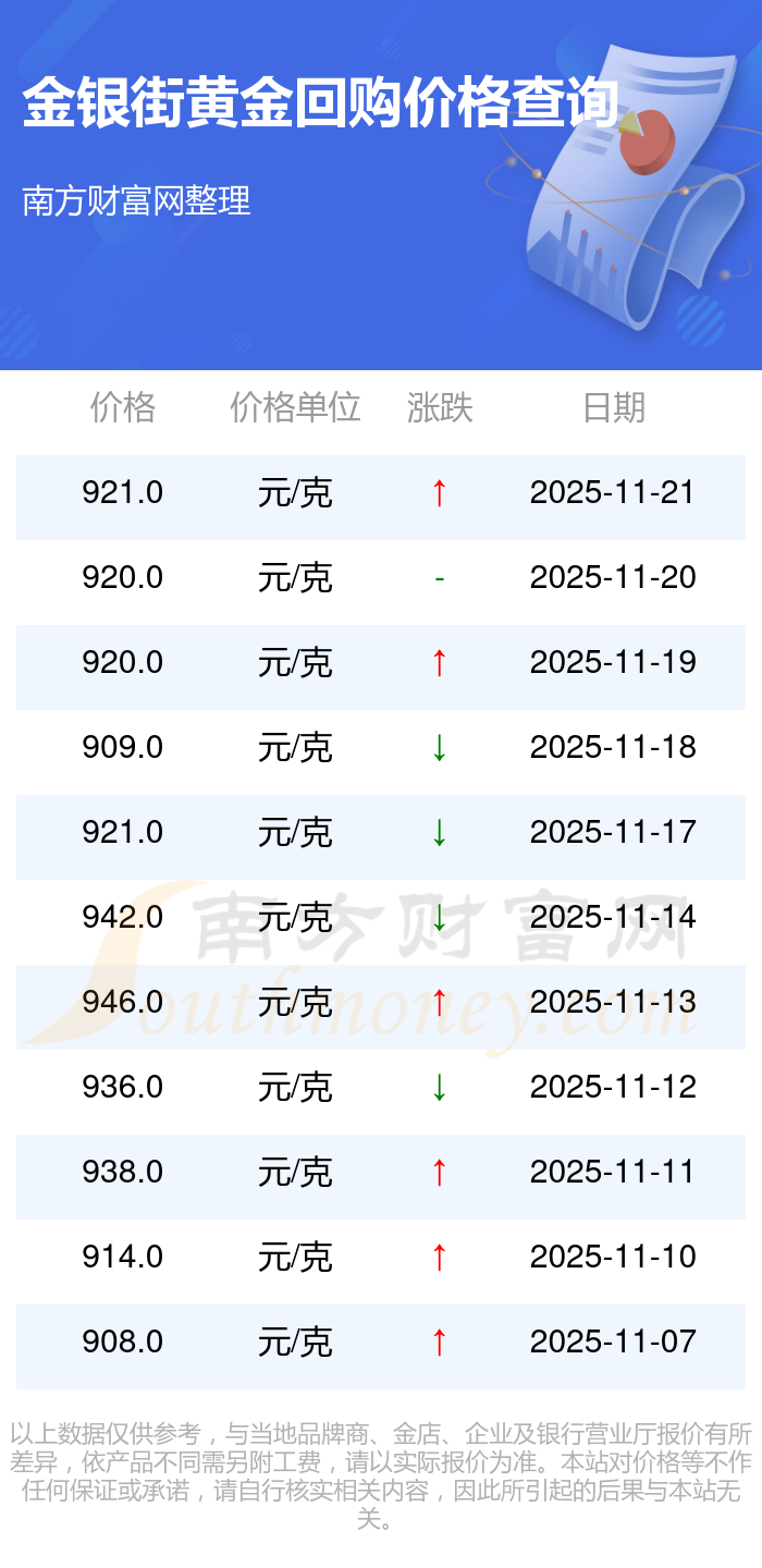2025年11月23日金银街黄金回购价格最新是921.0元/克。