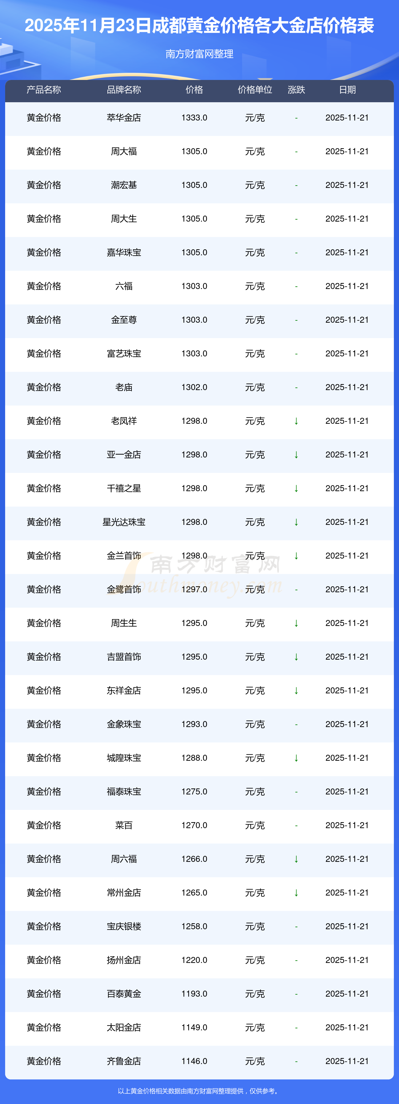 2025年11月23日成都周大福、周大福、周大福、周大福、周大福、周大福、周大福、老凤祥、老凤祥、老凤祥、周六福等各大金店品牌黄金价格最新价格行情来了,如下:周大福黄金价格1305.0元/克,周大福铂金价格616.0元/克,周大福饰品金价(内地)1305.0元/克,周大福黄金饰品(香港)45110.0,周大福铂金价格(香港)17570.0,周大福金条价格(香港)40690.0,周大福金条金价(内地)1143.0元/克,老凤祥黄金价格1298.0元/克,老凤祥铂金价格600.0元/克,老凤祥足金价格1298.0元/克,周六福黄金价格1266.0元/克。