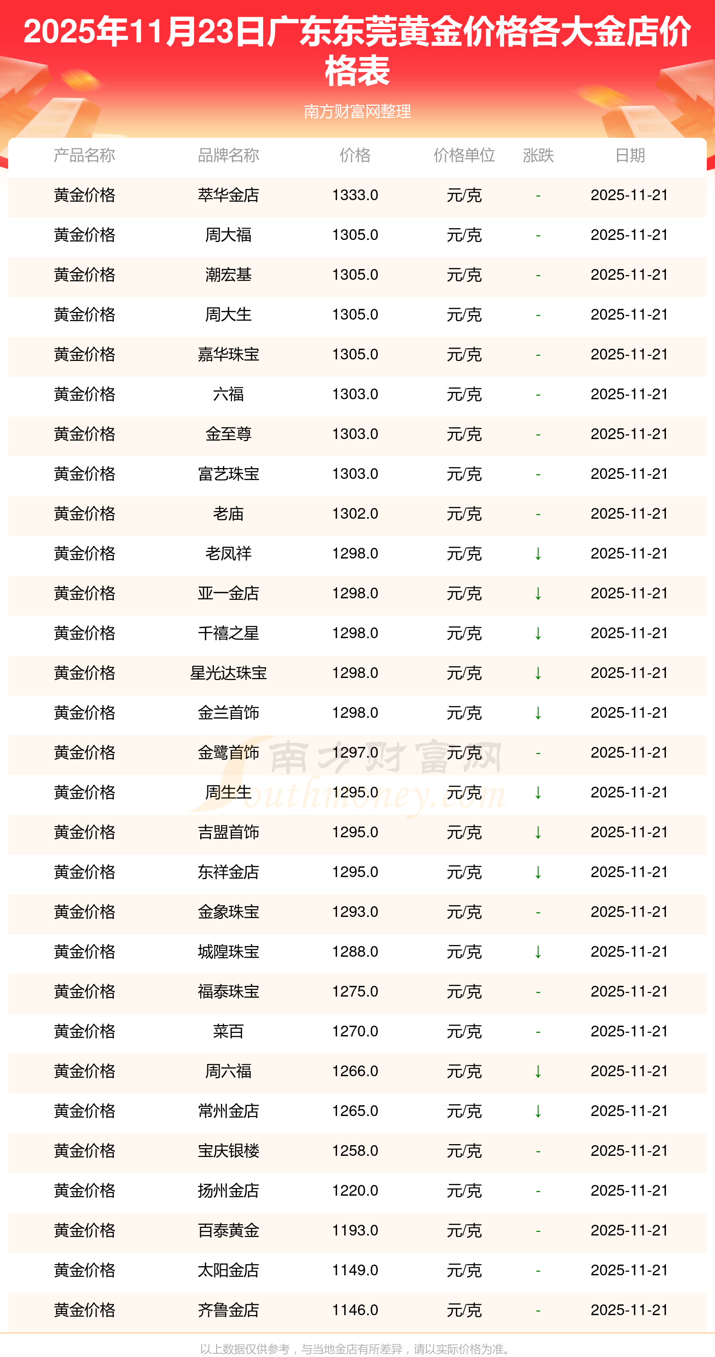 今天是2025年11月23日,广东东莞周大福、周大福、周大福、周大福、周大福、周大福、周大福、老凤祥、老凤祥、老凤祥、周六福等各大金店品牌黄金价格最新价格行情是这样的:周大福1305.0元/克、周大福616.0元/克、周大福1305.0元/克、周大福45110.0、周大福17570.0、周大福40690.0、周大福1143.0元/克、老凤祥1298.0元/克、老凤祥600.0元/克、老凤祥1298.0元/克、周六福1266.0元/克。