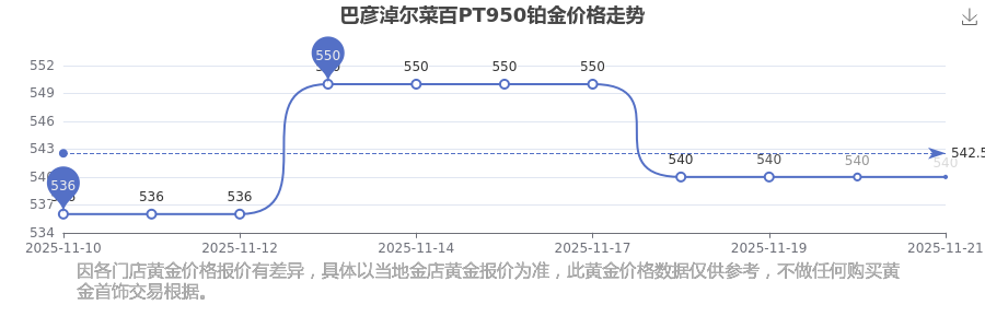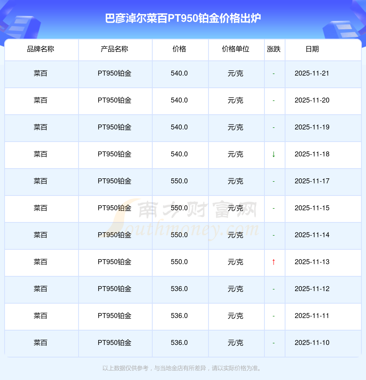 540.0元/克,此乃巴彦淖尔菜百于 2025年11月23日PT950铂金的挂牌价格。