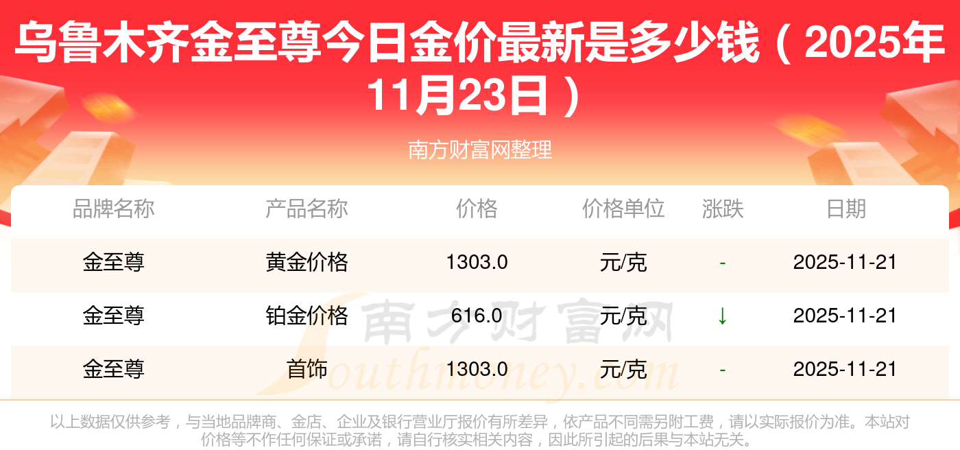 今日黄金价格查询_现在金价黄金一克多少钱,黄金价格是多少钱一克?2025年11月23日乌鲁木齐金至尊现在黄金一克要多少钱:黄金价格1305.0元/克,铂金价格616.0元/克,饰品金价(内地)1305.0元/克,黄金饰品(香港)45110.0,铂金价格(香港)17570.0,金条价格(香港)40690.0,金条金价(内地)1143.0元/克,黄金价格1298.0元/克,铂金价格600.0元/克,足金价格1298.0元/克,黄金价格1266.0元/克。