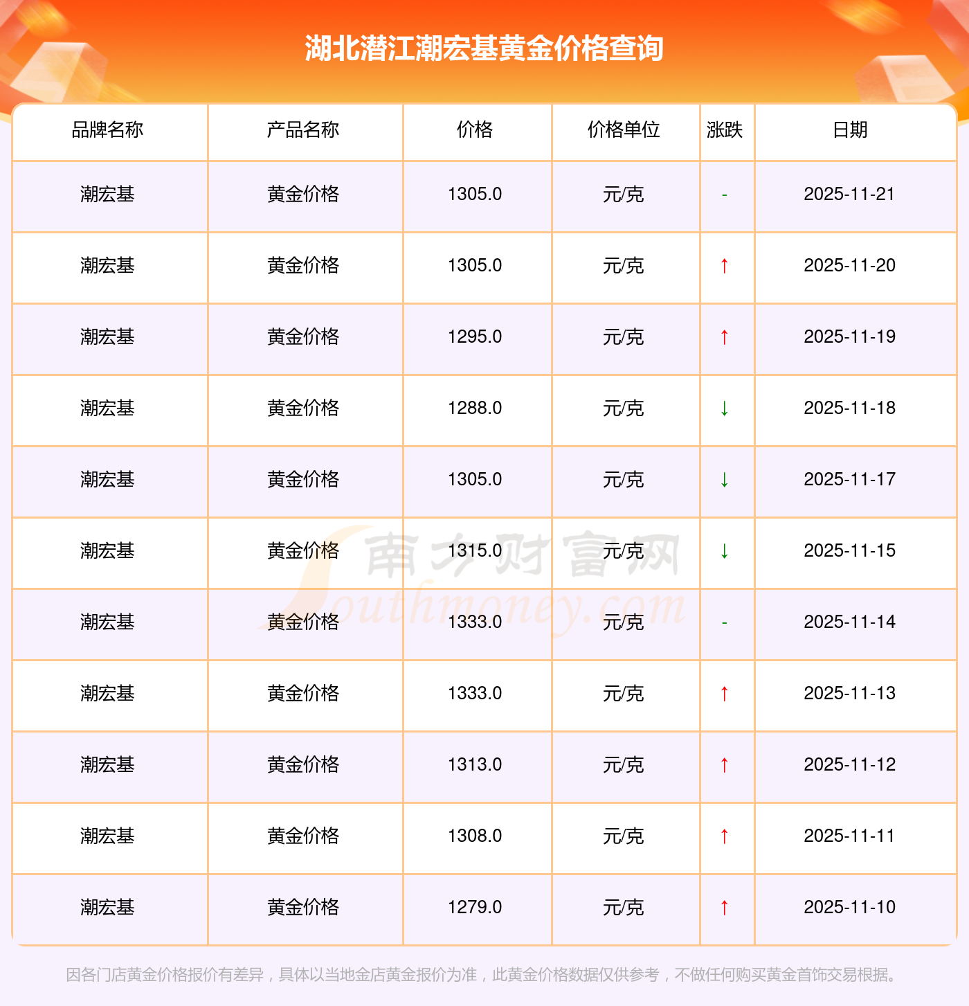 今日(2025年11月23日)湖北潜江潮宏基黄金价格最新价格为1305.0元/克。
