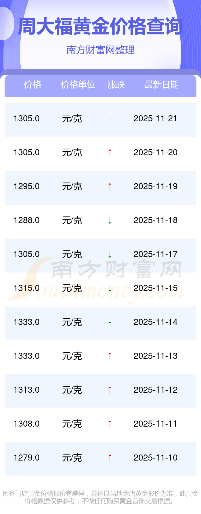 今日黄金价格查询_现在金价黄金一克多少钱,黄金价格是多少钱一克?黄金价格一般是多少钱一克?今日周大福黄金价格最新价格为1305.0元/克。