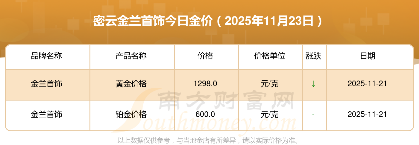 今日黄金价格查询_现在金价黄金一克多少钱,黄金价格是多少钱一克?2025年11月23日密云金兰首饰黄金一克的市场行情价是多少?黄金价格1305.0元/克,铂金价格616.0元/克,饰品金价(内地)1305.0元/克,黄金饰品(香港)45110.0,铂金价格(香港)17570.0,金条价格(香港)40690.0,金条金价(内地)1143.0元/克,黄金价格1298.0元/克,铂金价格600.0元/克,足金价格1298.0元/克,黄金价格1266.0元/克。