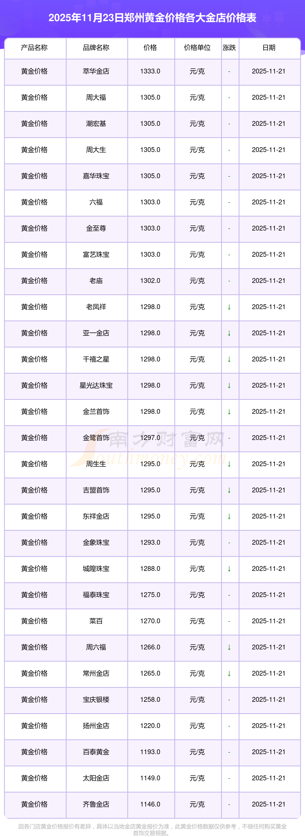 2025年11月23日,郑州周大福、周大福、周大福、周大福、周大福、周大福、周大福、老凤祥、老凤祥、老凤祥、周六福等各大金店品牌黄金价格今日价格行情最新来了:周大福1305.0元/克、周大福616.0元/克、周大福1305.0元/克、周大福45110.0、周大福17570.0、周大福40690.0、周大福1143.0元/克、老凤祥1298.0元/克、老凤祥600.0元/克、老凤祥1298.0元/克、周六福1266.0元/克。